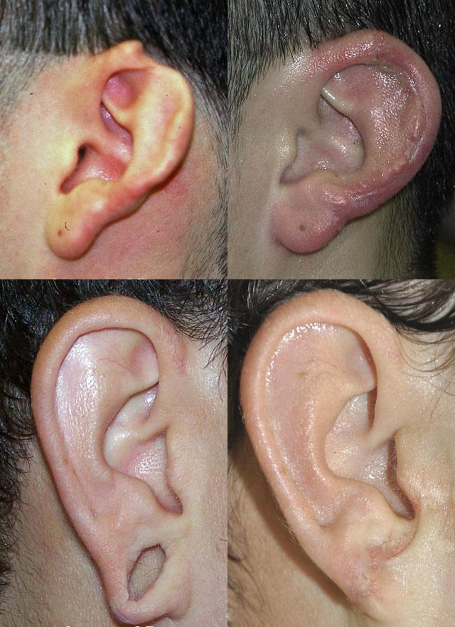 - Погіршення естетичного ефекту внаслідок неадекватної корекції або спонтанної деформації (викривлення або перетягування вушної раковини, перекоси її за типом «телефонного» або «зворотного телефонної» деформації, підкреслений рельєф хряща, асиметрія вух).